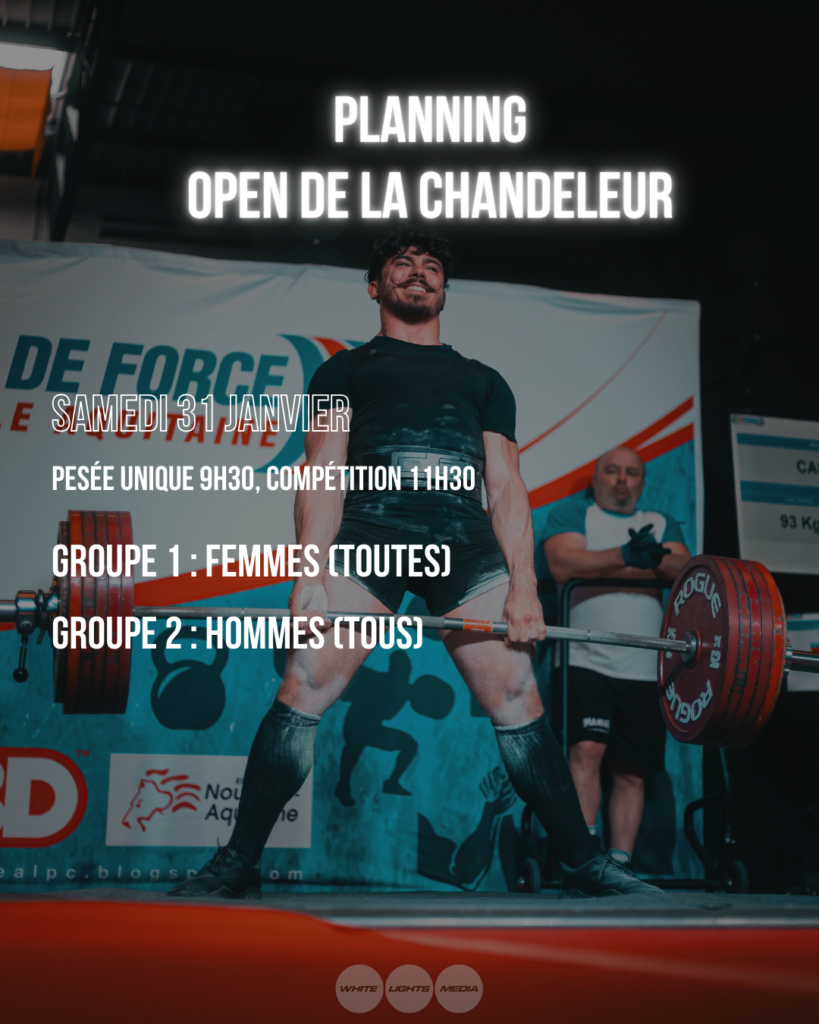 Pesée unique à 9h30, début de compétition à 11h30 pour les deux groupes (Femmes toutes catégories puis Hommes toutes catégories).